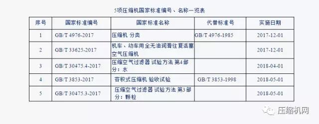 2017年第11號、第23號、第29號中華人民共和國國家標準公告,由國家質(zhì)量監(jiān)督檢驗檢疫總局、國家標準化管理委員會批準發(fā)布了共5項壓縮機國家標準,具體內(nèi)容見下表: